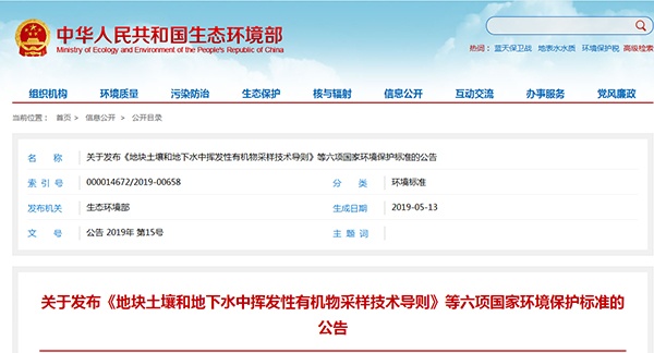 生態(tài)環(huán)境部發(fā)布《地塊土壤和地下水中揮發(fā)性有機物采樣技術導則》等六項國家環(huán)境保護標準