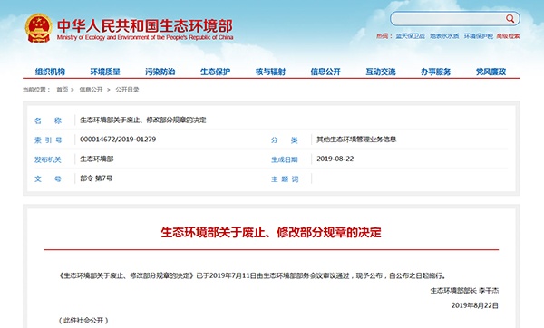 2019年8月22日,生態環境部發布關于廢止、修改部分規章的決定,詳情如下: