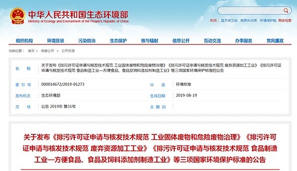 生態環境部關于發布《工業固體廢物和危險廢物治理》《廢棄資源加工工業》《食品制造工業—方便食品、食品及飼料添加劑制造工業》等3項排污許可證申請與核發技術規范的公告