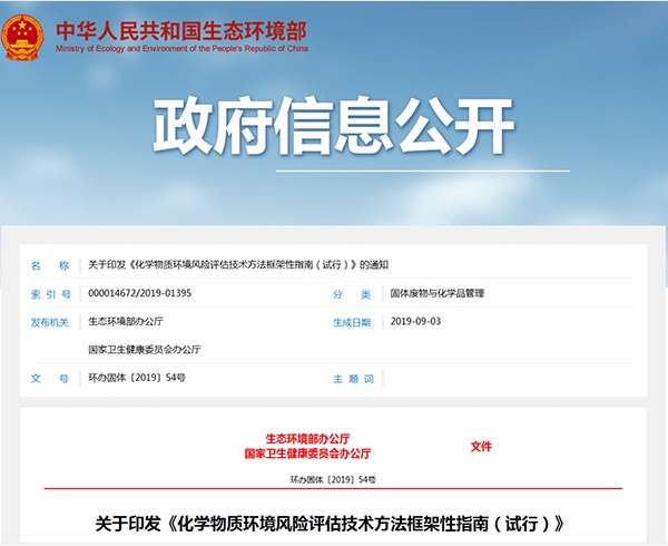 2019年9月3日,生態環境部、衛生健康委印發了《化學物質環境風險評估技術方法框架性指南(試行)》,詳情如下: