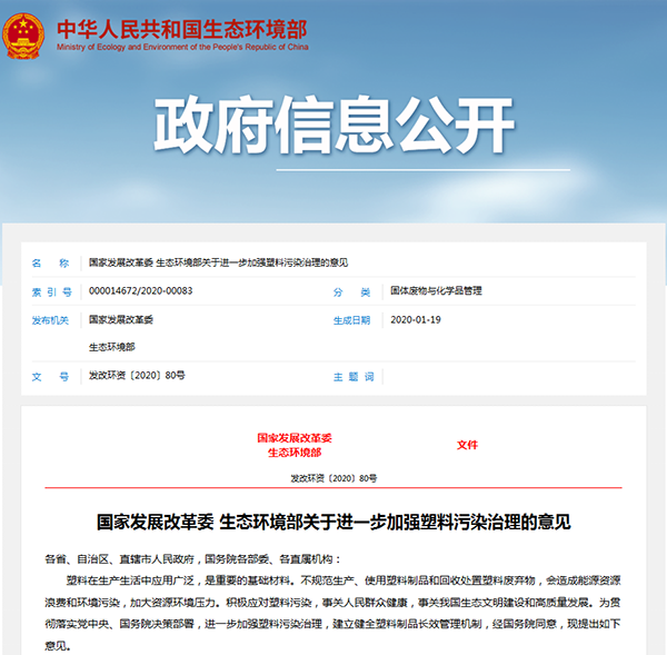 2020年1月19日,國家發展改革委、生態環境部聯合印發了《關于進一步加強塑料污染治理的意見》,詳情如下: