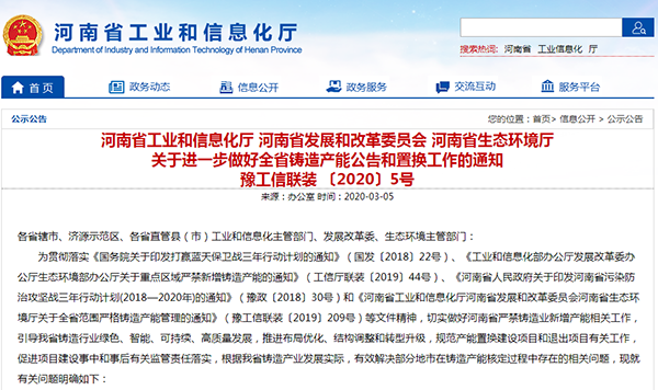 2020年3月5日,河南省工業和信息化廳、河南省發展和改革委員會、河南省生態環境廳聯合發布《關于進一步做好全省鑄造產能公告和置換工作的通知》(豫工信聯裝 〔2020〕5號),詳情如下: