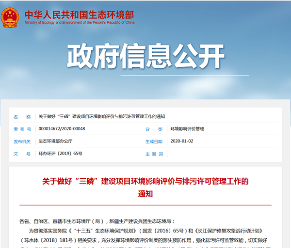 2020年1月2日,生態環境部辦公廳發布了《關于做好“三磷”建設項目環境影響評價與排污許可管理工作的通知》,詳情如下:
