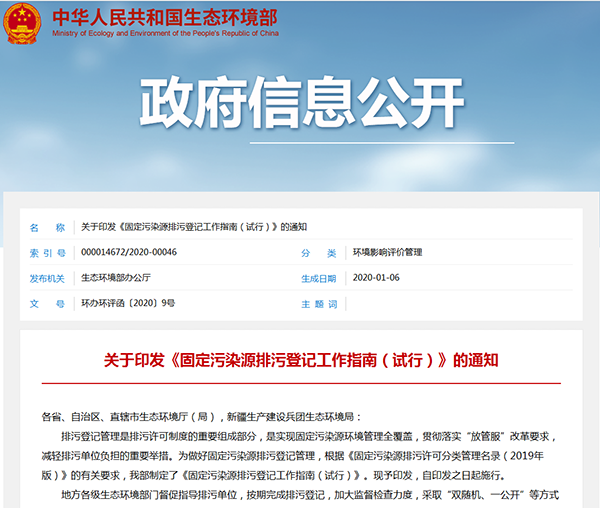 2020年1月6日,生態(tài)環(huán)境部辦公廳印發(fā)了《固定污染源排污登記工作指南(試行)》,詳情如下: