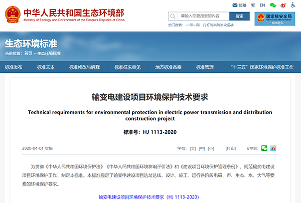 2020年2月27日,生態環境部發布《輸變電建設項目環境保護技術要求》(HJ 1113-2020),2020年4月1日起實施。