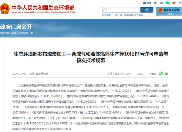 生態(tài)環(huán)境部發(fā)布煤炭加工-合成氣和液體燃料生產(chǎn)等10項排污許可申請與核發(fā)技術(shù)規(guī)范