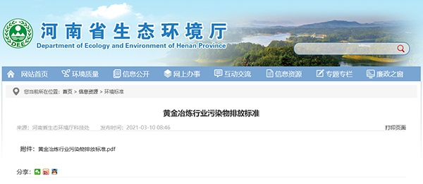 河南省《黃金冶煉行業污染物排放標準》(DB41/2088-2021)已經省政府同意,并于2021年1月20日由省生態環境廳、省市場監督管理局聯合發布,2021年3月1日起實施。