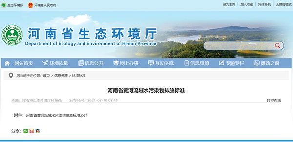 《河南省黃河流域水污染物排放標準》(DB41/2087-2021)已經省政府同意,并于2021年1月20日由省生態環境廳、省市場監督管理局聯合發布,2021年3月1日起實施。