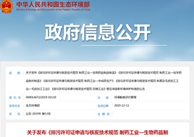2019年12月11日,生態(tài)環(huán)境部發(fā)布《排污許可證申請(qǐng)與核發(fā)技術(shù)規(guī)范 制藥工業(yè)—生物藥品制品制造》《排污許可證申請(qǐng)與核發(fā)技術(shù)規(guī)范 制藥工業(yè)—化學(xué)藥品制劑制造》《排污許可證申請(qǐng)與核發(fā)技術(shù)規(guī)范 制藥工業(yè)—中成藥生產(chǎn)》《排污許可證申請(qǐng)與核發(fā)技術(shù)規(guī)范 制革及毛皮加工工業(yè)—毛皮加工工業(yè)》《排污許可證申請(qǐng)與核發(fā)技術(shù)規(guī)范 印刷工業(yè)》