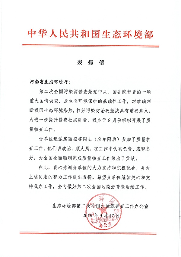 根據(jù)《關(guān)于開展第二次全國污染源普查質(zhì)量核查工作的通知》(國污普〔2019〕6號)和《關(guān)于抽調(diào)人員參加第二次全國污染源普查質(zhì)量核查工作的通知》的要求,我公司項目組成員張潔于2019年8月19日至24日參加生態(tài)環(huán)境部普查辦第一輪第二次全國污染源普查天津市質(zhì)量核查工作。在此次質(zhì)量核查工作過程中,張潔認真負責,技術(shù)能力突出,任勞任怨,表現(xiàn)良好,受到生態(tài)環(huán)境部普查辦表揚。