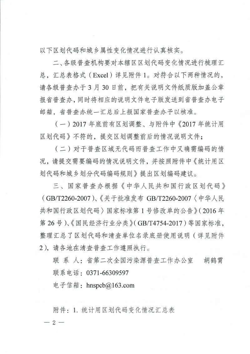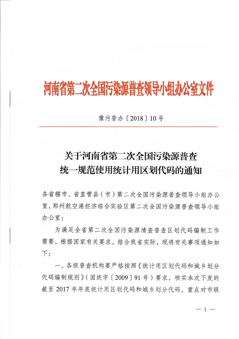 豫污普辦【2018】10號關于河南省第二次全國污染源普查統一規范使用統計用區劃代碼的通知