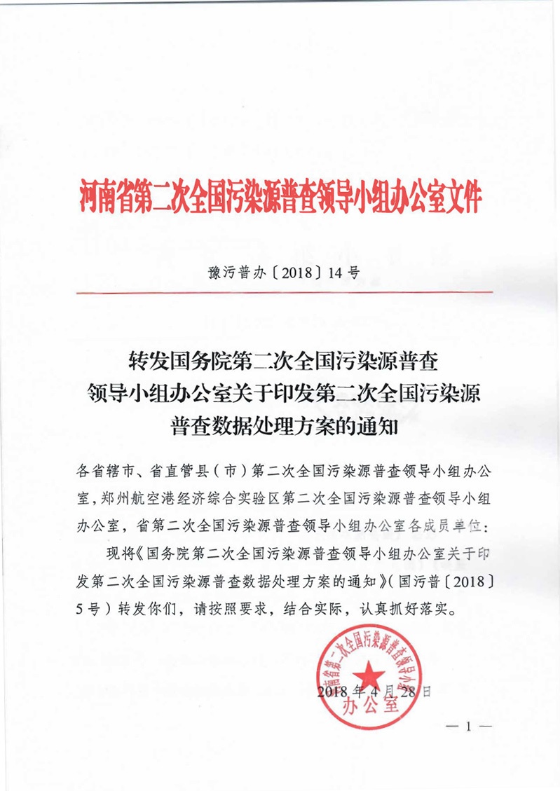上一篇:豫污普辦【2018】13號關(guān)于加快推進(jìn)河南省第二次全國污染源普查清查建庫工作的緊急通知 下一篇:豫污普辦【2018】15號轉(zhuǎn)發(fā)國污普領(lǐng)導(dǎo)小組辦公室關(guān)于加強(qiáng)第二次全國污染源普查保密管理工作的通知(1)