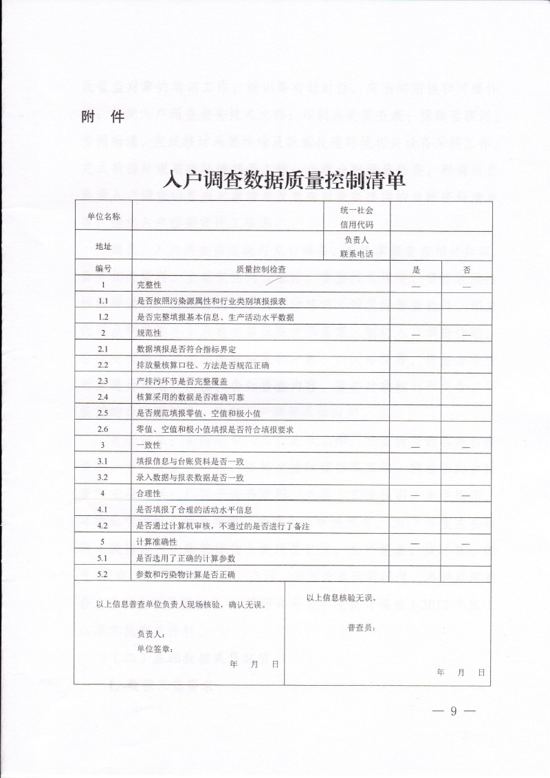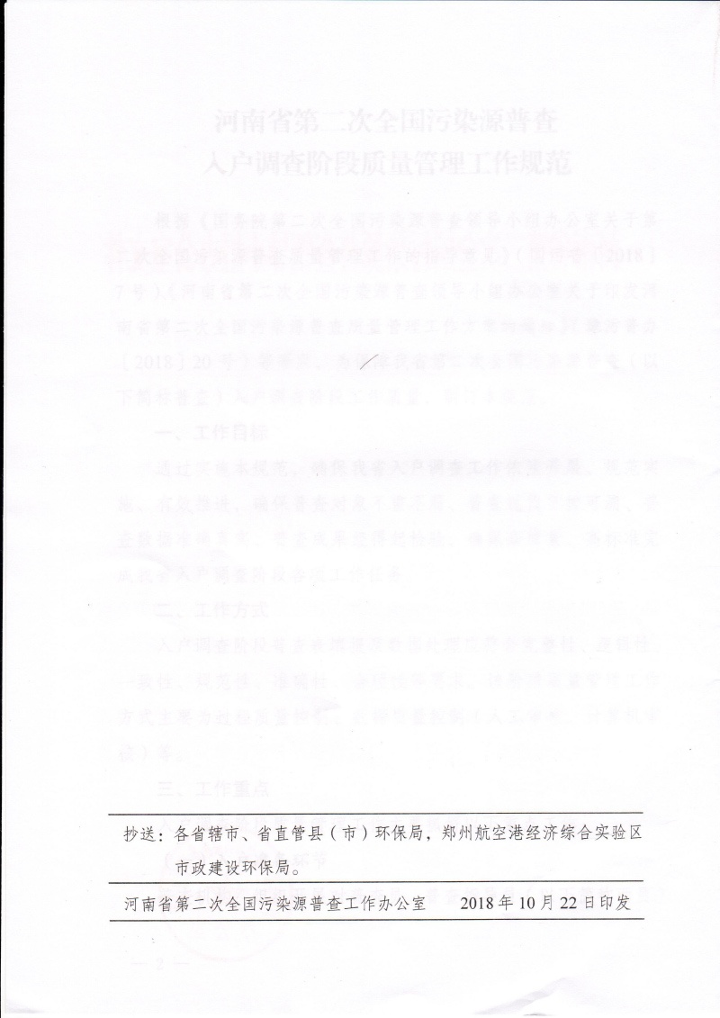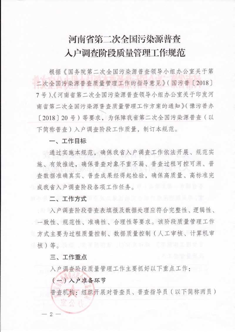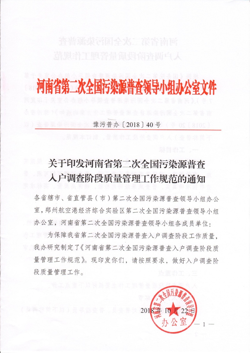 豫污普辦【2018】40號關于印發河南省第二次全國污染源普查入戶調查階段質量管理工作規范的通知